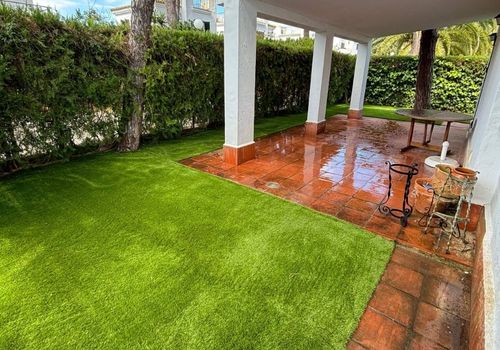 Combinamos el césped con sombrillas de brezo o mimbre para lograr una estética orgánica y acogedora.